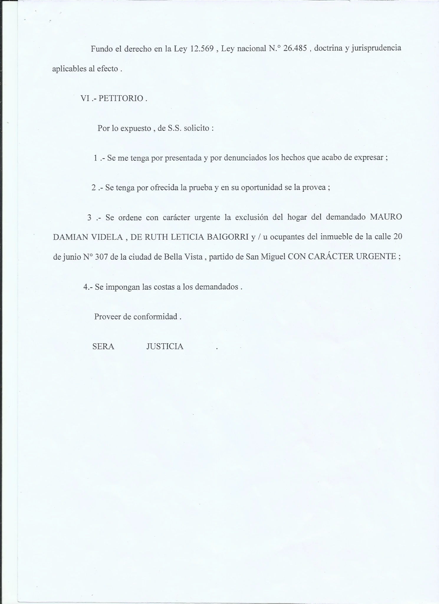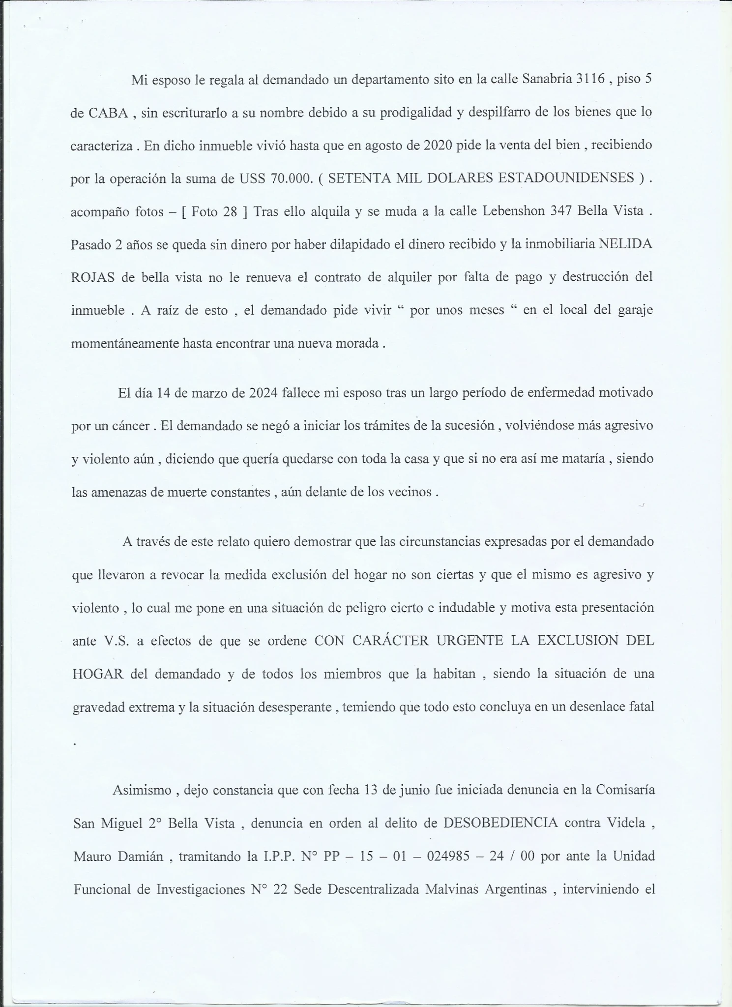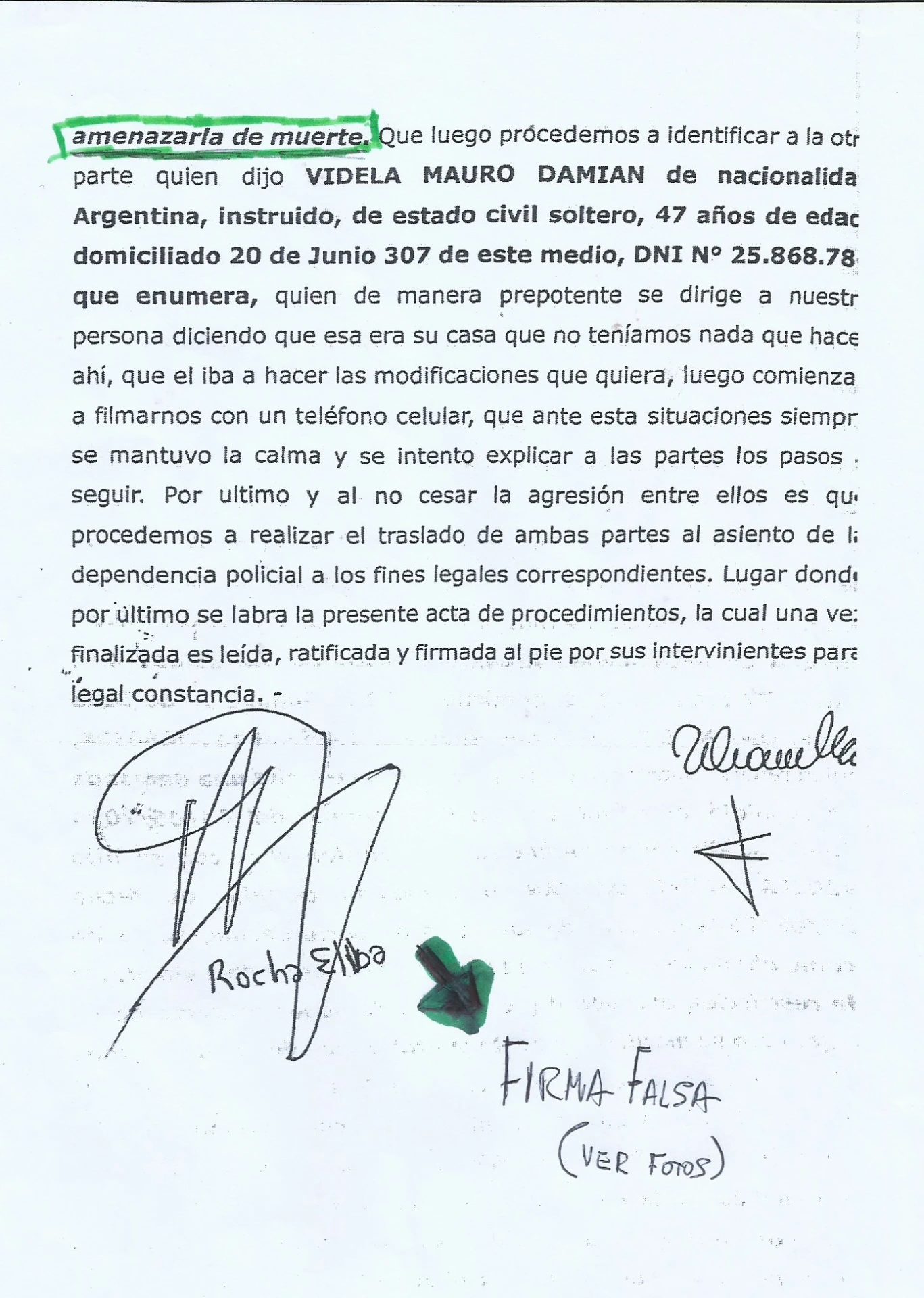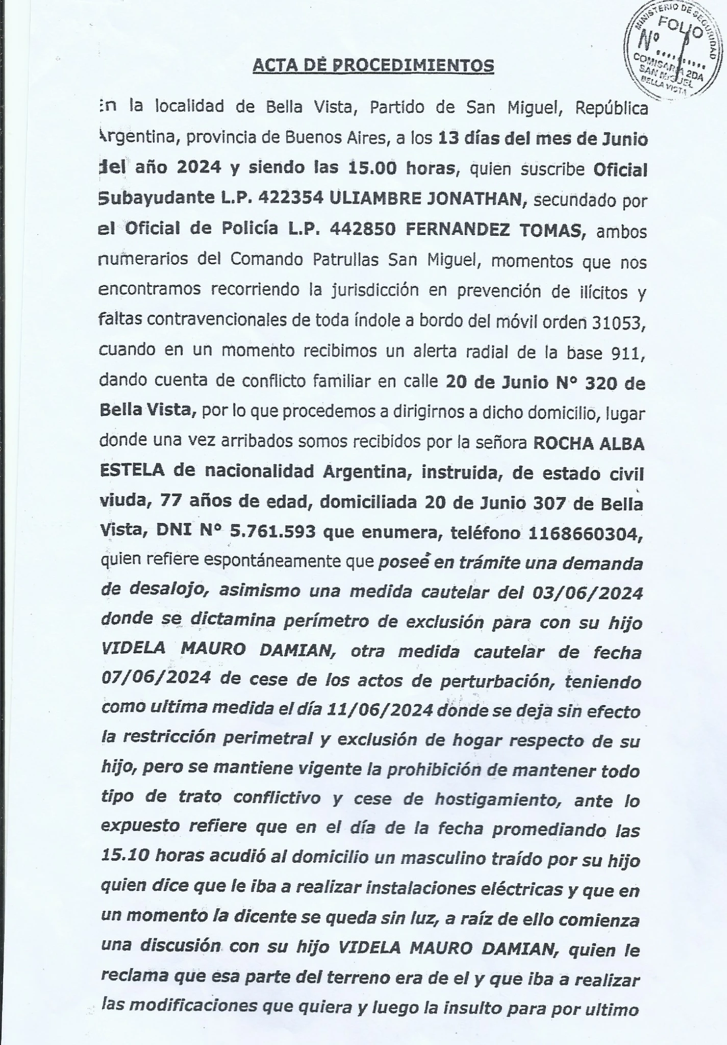 1- La Participacion de la Policia, ya que recientemente nos enteramos de esa PP donde le FALSIFICAN BURDAMENTE la Firma, Con la Cual si REALMENTE la firmara la Dra. Alba estela Rocha, y con los Abogados que teniamos en ese momento, Hariamos una presentacion en Fiscalia General, y que nos explique COMO con una simple DENUNCIA a las 72hs. Excluyen del hogar a Mauro Videla, Por AMENAZAS DE MUERTE contra su Madre y la irregularidad de dar vuelta la medida a los 3 DIAS por el Juzgado de Paz, con la IMPUNIDAD de seguir AMENAZANDO DE MUERTE a su madre DELANTE DE LA POLICIA y PERMITIRLE EL INGRESO A LO PATOTERO Y LA POLICIA.... LA JUSTICIA.... ???