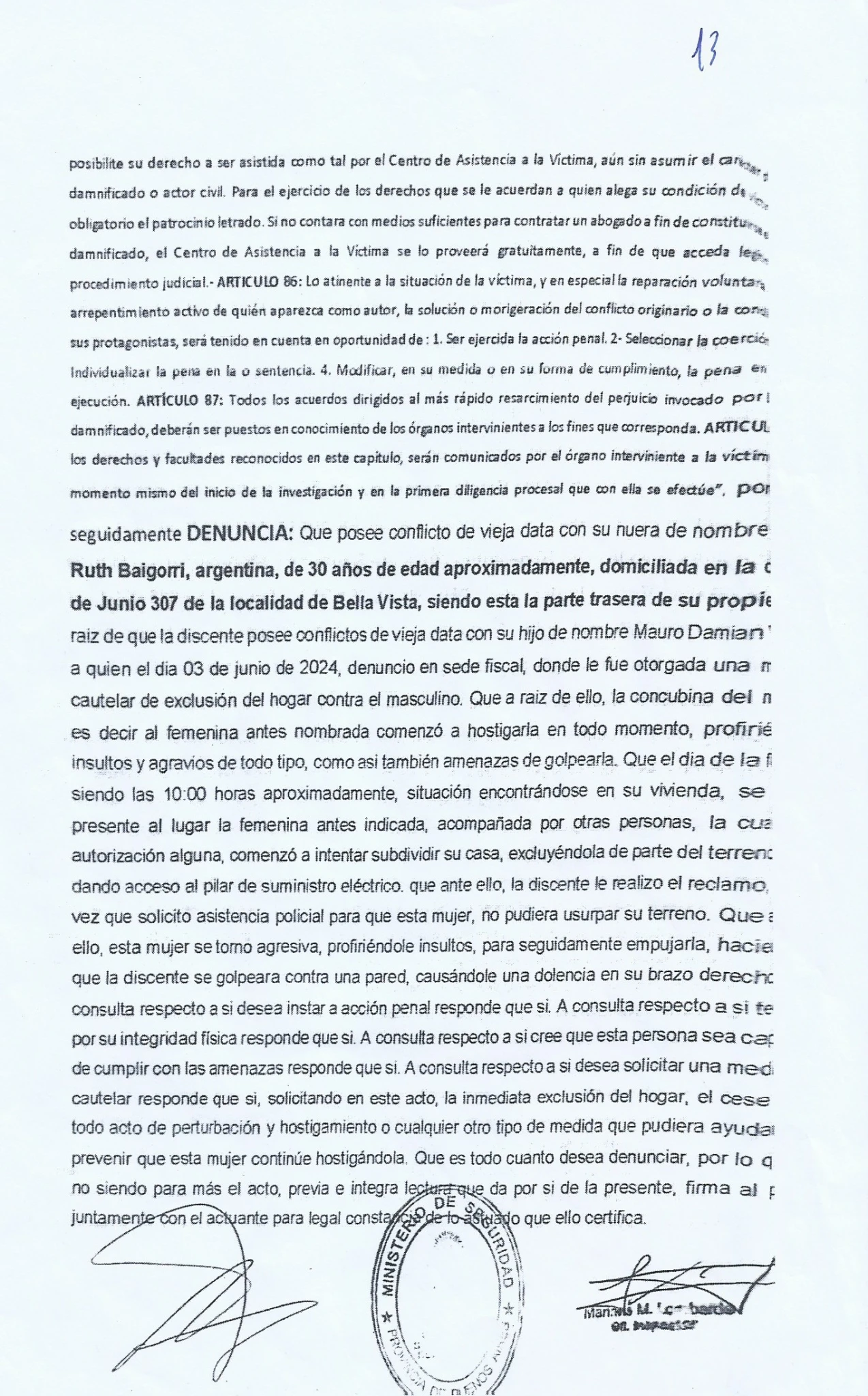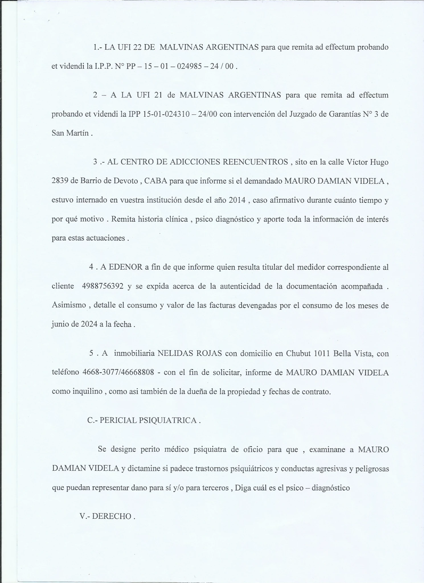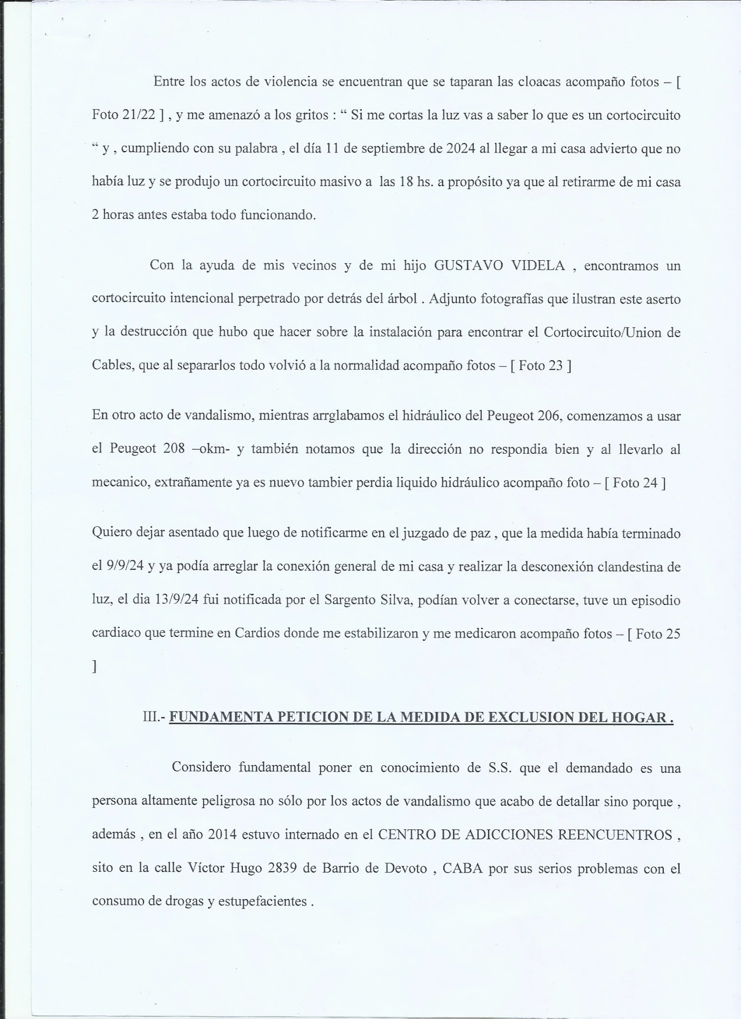 1- La Participacion de la Policia, ya que recientemente nos enteramos de esa PP donde le FALSIFICAN BURDAMENTE la Firma, Con la Cual si REALMENTE la firmara la Dra. Alba estela Rocha, y con los Abogados que teniamos en ese momento, Hariamos una presentacion en Fiscalia General, y que nos explique COMO con una simple DENUNCIA a las 72hs. Excluyen del hogar a Mauro Videla, Por AMENAZAS DE MUERTE contra su Madre y la irregularidad de dar vuelta la medida a los 3 DIAS por el Juzgado de Paz, con la IMPUNIDAD de seguir AMENAZANDO DE MUERTE a su madre DELANTE DE LA POLICIA y PERMITIRLE EL INGRESO A LO PATOTERO Y LA POLICIA.... LA JUSTICIA.... ???