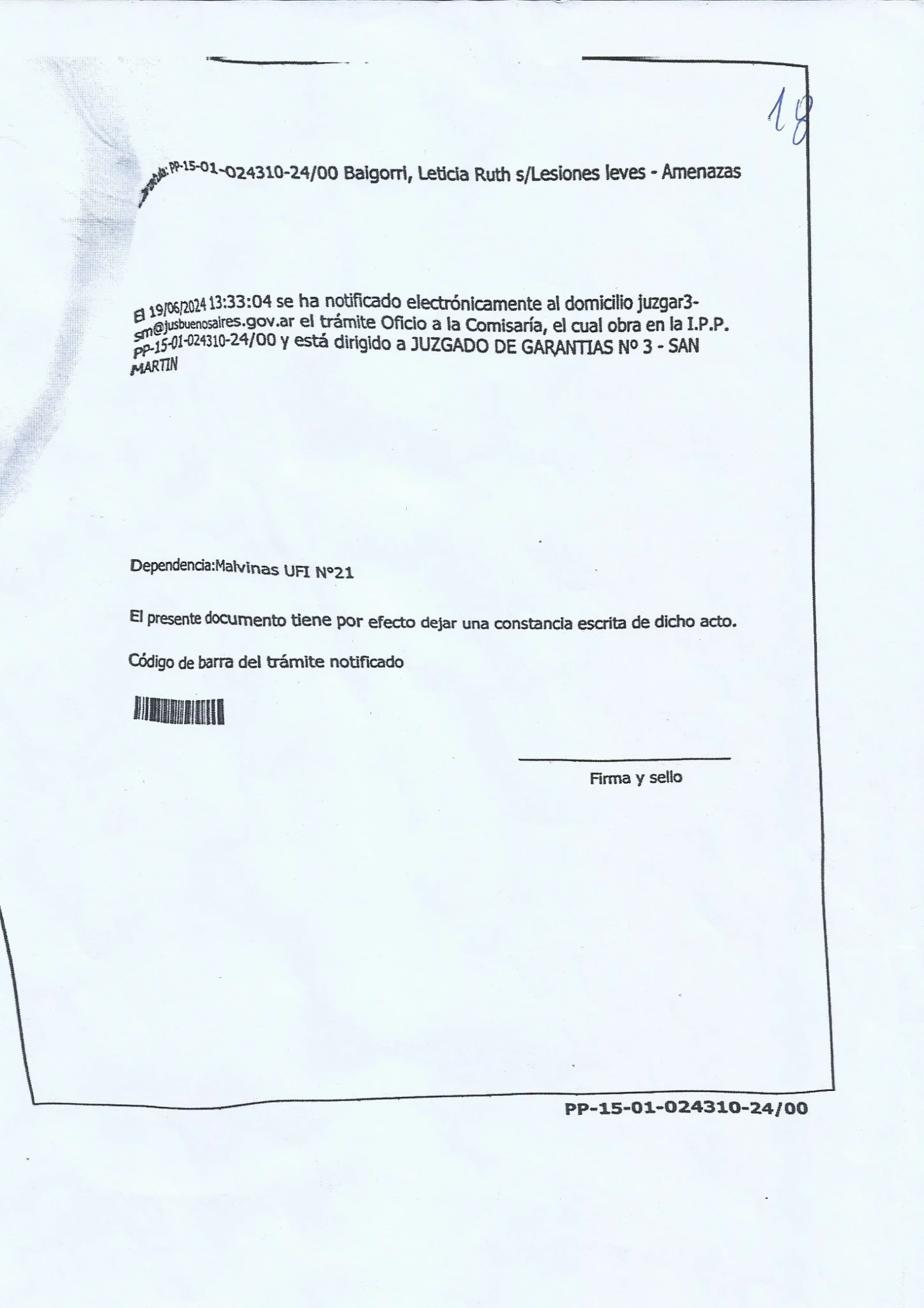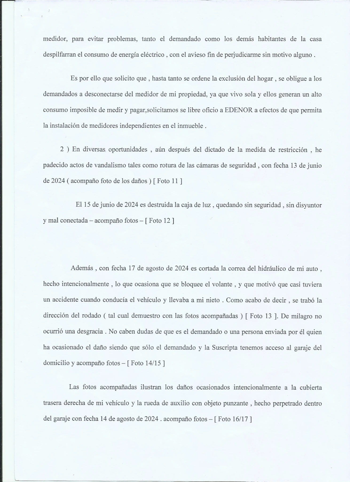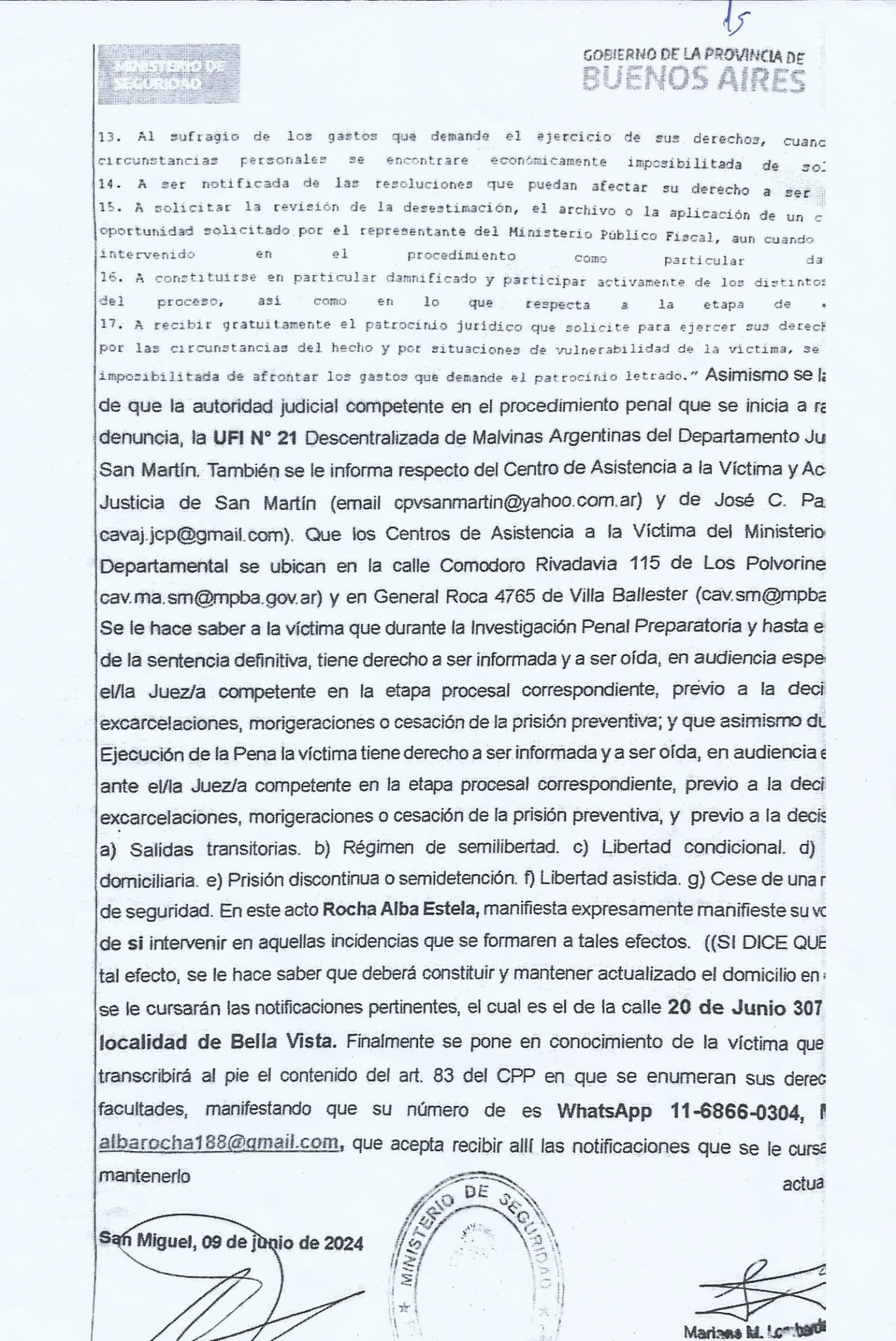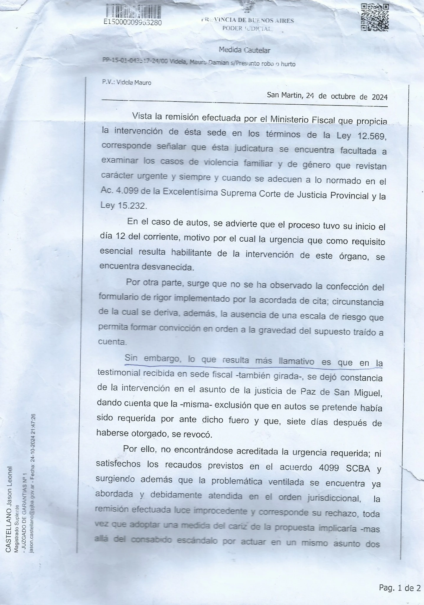 1- La Participacion de la Policia, ya que recientemente nos enteramos de esa PP donde le FALSIFICAN BURDAMENTE la Firma, Con la Cual si REALMENTE la firmara la Dra. Alba estela Rocha, y con los Abogados que teniamos en ese momento, Hariamos una presentacion en Fiscalia General, y que nos explique COMO con una simple DENUNCIA a las 72hs. Excluyen del hogar a Mauro Videla, Por AMENAZAS DE MUERTE contra su Madre y la irregularidad de dar vuelta la medida a los 3 DIAS por el Juzgado de Paz, con la IMPUNIDAD de seguir AMENAZANDO DE MUERTE a su madre DELANTE DE LA POLICIA y PERMITIRLE EL INGRESO A LO PATOTERO Y LA POLICIA.... LA JUSTICIA.... ???