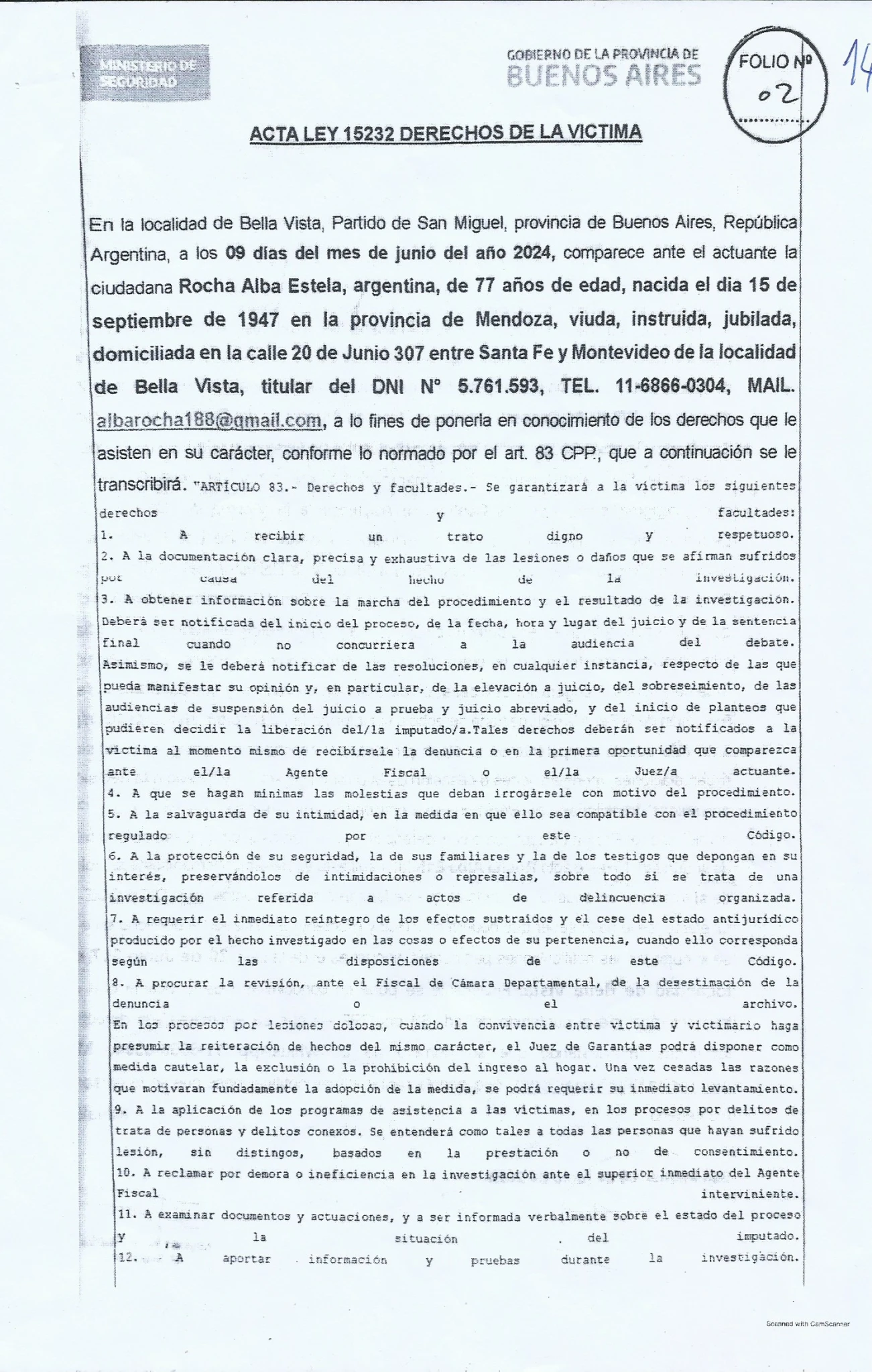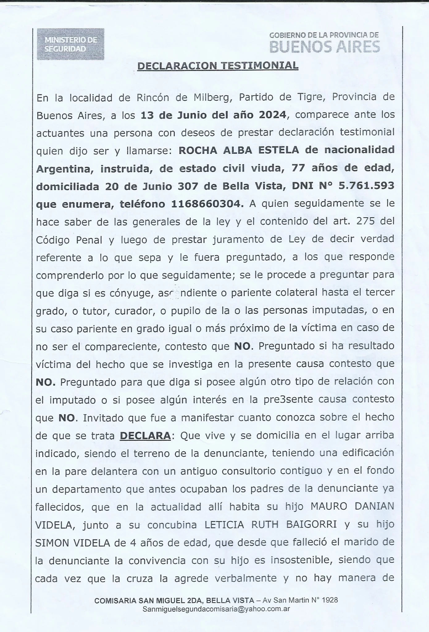 2- Ese mismo dia le dan una DECLARACION TESTIMONIAL con la direccion de su otro hijo Gustavo Videla, Al cual le TOMARON LA CASA. En tigre Comisaria Rincon de Milberg. Con los mismos datos, y el membrete de Comisaria 2da. Bella Vista.
