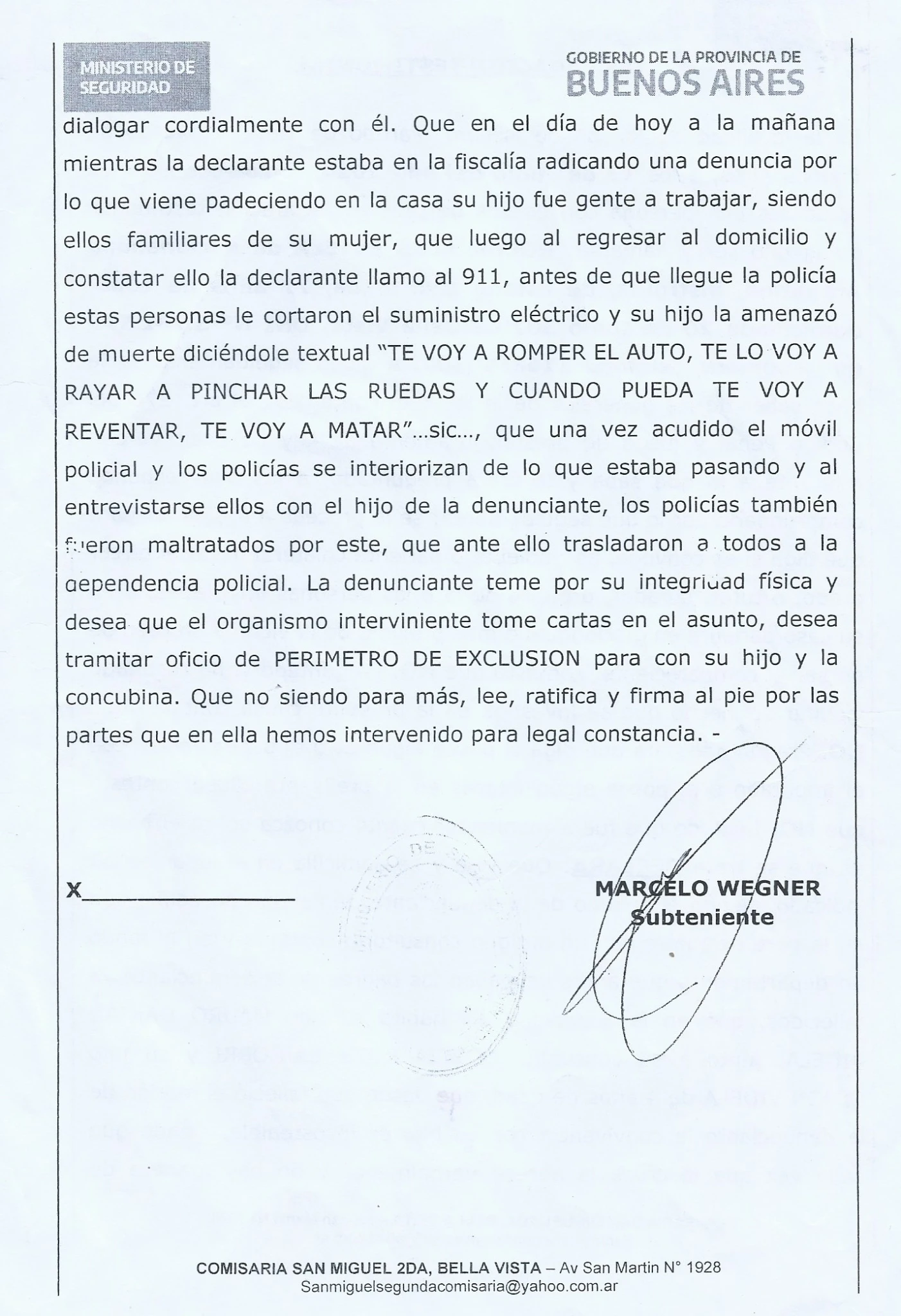 El dia 13 de junio la Comisaria 2da. de Bella Vista. El Juzgado de Paz de Sn Miguel, al dar una medida por 180 dias, y anularla a los cuatro DIAS, Sin entender porque se da de baja una medida por 180 dias, Y CONFIANDO EN LA JUSTICIA, Nos acercamos al Juzgado de Paz de San MIguel para pedir EXPLICACIONES.....Y SIEMPRE QUE FUIMOS NOS MALTRATARON DEMOSTRANDO UNA IMPUNIDAD TOTAL, La Cual era tan EVIDENTE , Que la Comisaria de Bella Vista, Genera la presente PP , Demostrando que MAURO VIDELA, SIGUE AMENAZANDO DE MUERTE A LA DENUNCIANTE (SU MADRE) AUN DELANTE DE LA POLICIA, EJERCIENDO DESOBEDIENCIA DE LA CONVIVENCIA Y TURBACION DE LA POSECION. Quedando IMPUTADO.