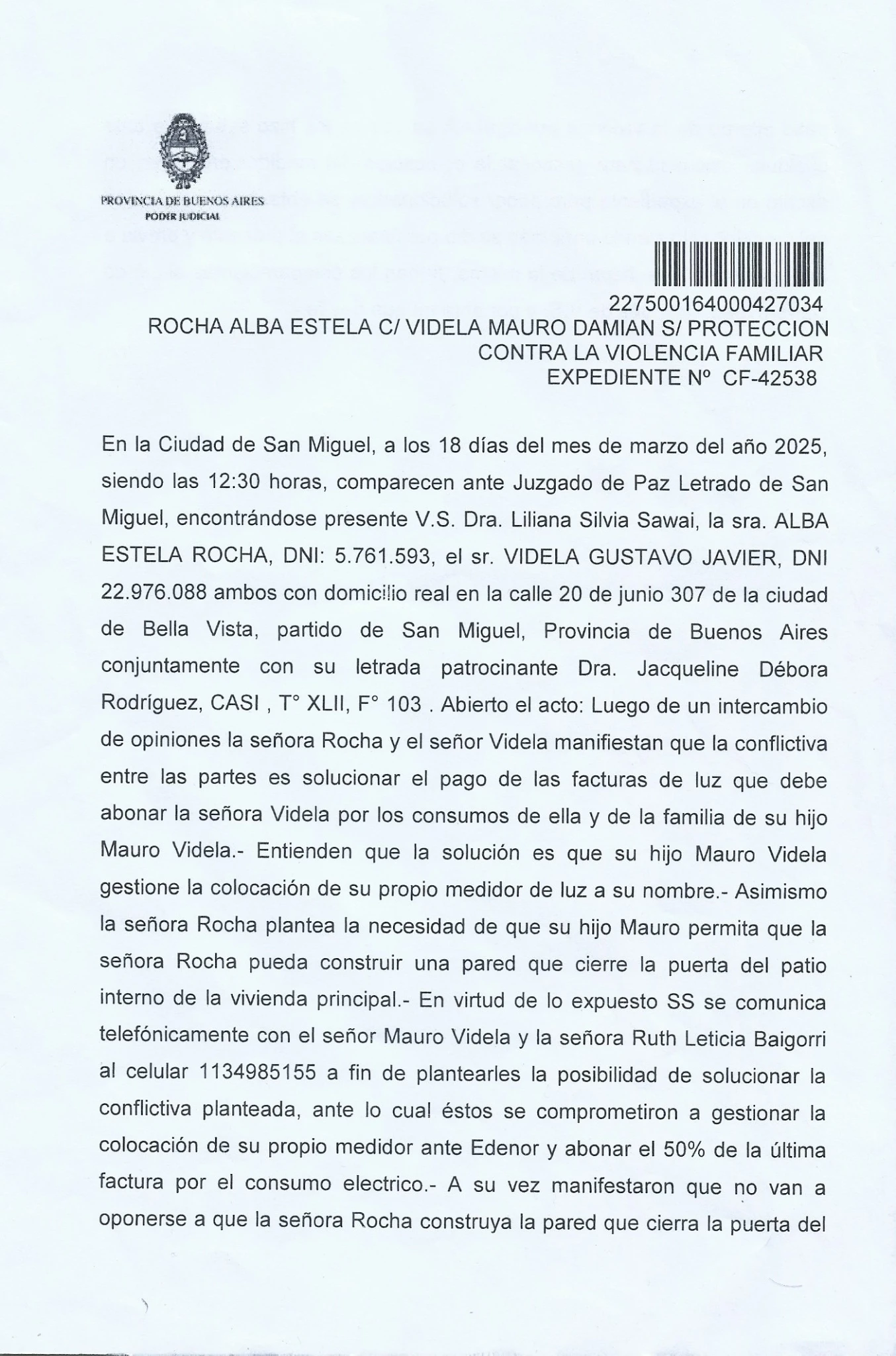 ´´ ROCHA ALBA ESTELA C/ VIDELA MAURO DAMIAN S/ PROTECCION CONTRA LA VIOLENCIA FAMILIAR ´´ EXPTE N. CF-42538